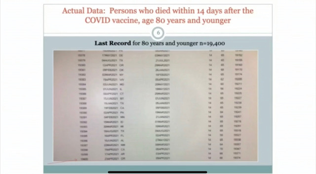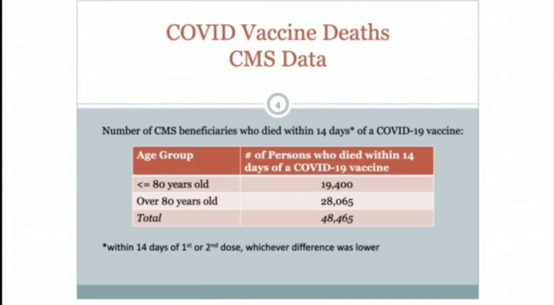 Renz said that his original estimate of 45,000 US deaths from the Covid jab is actually too low now, that the number is far more. To be precise, 48,465 of CMS (Centers for Medicare and Medicaid Services) beneficiaries died within 14 days of being Covid vaccinated (in some cases with the first dose alone and in other cases with both). While it is possible that some of these people had other causes of death as well, Renz said he is almost certain most did not. 19,400 of these deaths were for people 80 years and younger, meaning many of these people would normally have had a very high chance of surviving Covid. And they were vaccinated—the gift from God, the jab that will save us all! Yet they didn’t survive; they died.