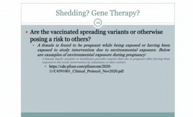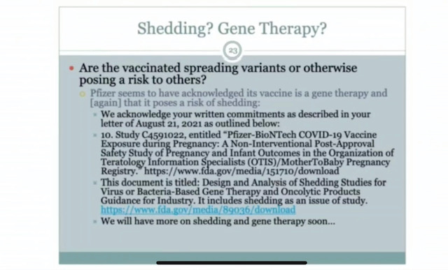And the big kicker—the vaccinated “shed” or spread variants of Covid to others due to the “gene therapy” vaccine. As I said above, my whole family got sick from a fully vaxxed person (who was herself very sick with Covid). Referencing the argument that we all have to get the vaccine to keep someone safe, Renz said, “You gotta quit getting it, ’cause you’re making me sick!” The info in this slide is from a study (note the link) which examined the shedding of the vaxxed.