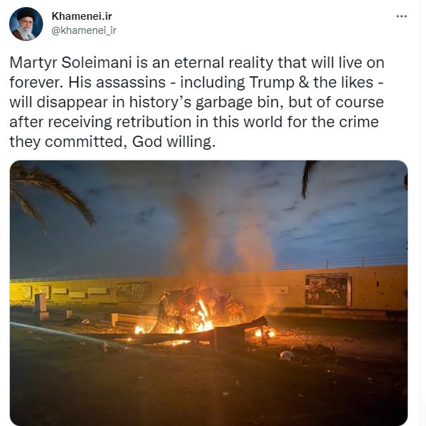 Trump’s Secretary of State Mike Pompeo is also shown being targeted by the drone in the video. And yet the Ayatollah’s account remains on Twitter—in fact, the Ayatollah’s account has been tweeting out extravagant praise for the murderous terrorist Soleimani and threatening “retribution in this world” against Trump—while Trump is banned from Twitter for supposedly inciting violence.