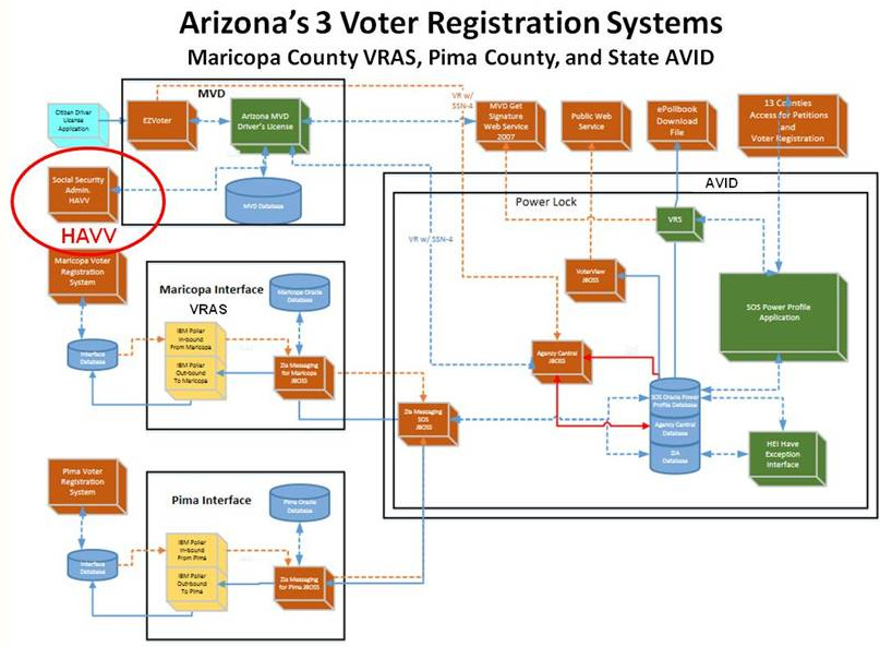 The image below shows the only 3 voter registrations systems in Arizona and many of the interfaces. This includes Maricopa’s VRAS sy[s]tem, the Pima County system, and the State-based system called AVID used by all other counties. The HAVV Interface processes data through the MVD. Because of this, it’s unclear which of these 3 voter registration systems, or possibly a commercial service, is pushing this massive number of ID verification requests to the SSA.