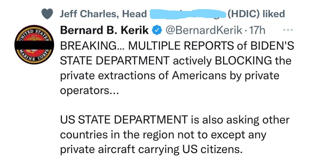 Not only did the Biden administration evacuate tens of thousands of Afghans while failing to evacuate the vast majority of Americans, but new reports are that the Biden administration has actively sought to prevent evacuations, telling local governments NOT to cooperate with private individuals/organizations rescuing those stranded in Afghanistan. According to Erik Prince on Bannon’s War Room today, the private rescuers have actually been threatened by Biden’s miscalled Department of Justice, as the rescuers have been told “pack up, go home, and. . .stop doing this on your own or DOJ is going to come after you.” If this is not deliberate crime, I don’t know what is. It’s infernal.