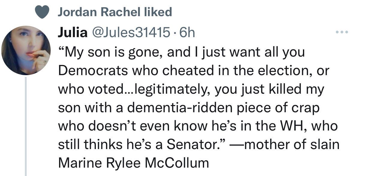 Below is a message from the mother of one of the brave Marines killed by the Muslim terrorists (almost certainly with Taliban involvement) in Kabul the other day. I think the message—that the Democrats and the election fraud enablers of both parties have blood on their hands—is spot on.
