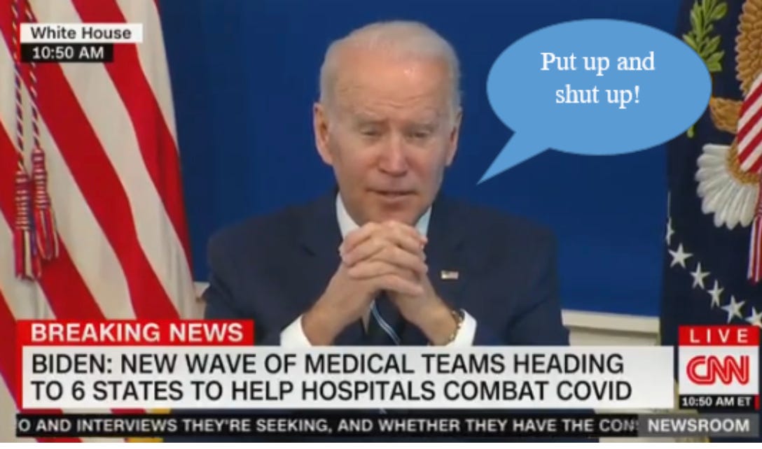 “You haven’t gotten vaccinated, do it. Personal choice impacts us all, our hospitals, our countries,” Biden insisted in his usual creepy undertone. In other words, there is no personal choice. Forget the Constitution, and the Nuremberg Code, and basic human rights—take the death jab or else!