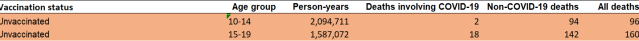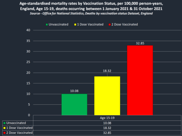 An official dataset from the governmental Office for National Statistics (ONS) of the United Kingdom inadvertently revealed a sobering truth: “Official Data shows Children are up to 52 times more likely to die following Covid-19 Vaccination than Unvaccinated Children & the ONS is trying to hide it.” Specifically, here is part of Table 9 of the dataset: