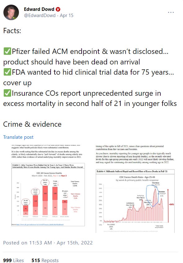According to former Blackrock fund manager Edward Dowd on Gettr, Pfizer’s Covid-19 vaccine should have been “dead on arrival” because it failed “ACM endpoint.” Per the NIH website, ACM stands for “all-cause mortality,” and relates to the number of adverse events a certain vaccine or medical drug causes during studies. In other words, it seems the Pfizer-BioNTech Covid vaccine caused too many adverse events in trials to be deemed safe for the public. Yet it was authorized, and aggressively pushed, by the US government.