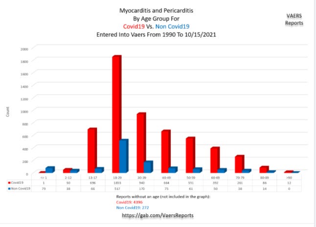 A VAERS chart (below) was posted on Gab that shows myocarditis (a disease with a high fatality rate) and pericarditis are significantly more likely to be in vaccinated Americans than unvaccinated Americans. And, scarily, these dangerous vaccine injuries are showing up most in the 18 to 29 year old age group.