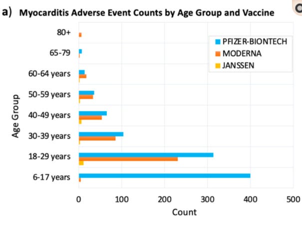 You may be somewhat skeptical of the source of this chart, but it does tally with other government-published research. A study on the NIH website which used VAERS data also recognizes that vaccines are most dangerous to the 6 to 29 year old category in terms of causing myocarditis.