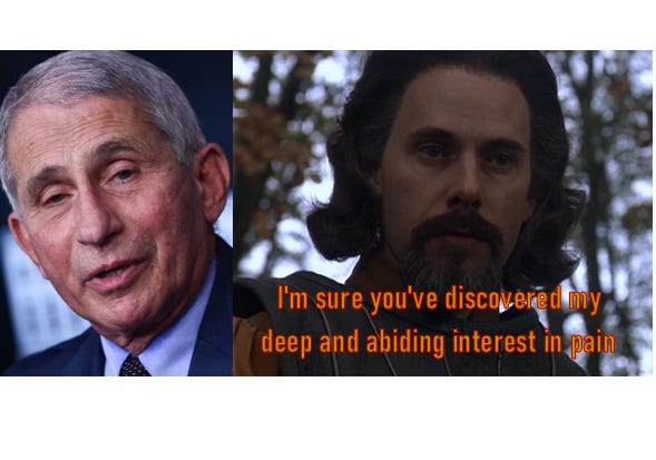 Oh, and Dr. Fauci—the expert of all experts, the beneficent, the merciful—was responsible for delaying treatments to AIDS sufferers which cost tens of thousands of lives. And more recently he spent millions of taxpayer dollars on the Tunisian study “where beagle dogs were eaten alive by parasite-infected flies” and on the “toxic brain injection” experiments on monkeys. I swear, Fauci is starting to sound like sadistic Prince Humperdinck or Count Rugen in The Princess Bride (both the book and the movie). It sounds too crazy to be anything but a fairy tale. Truth is stranger than fiction, unfortunately.