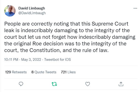 I’m not the only person to note that Roe was unconstitutional, either. Here is Rush Limbaugh’s brother, lawyer David Limbaugh: