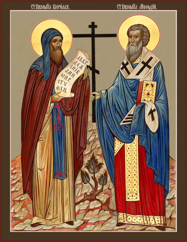 This holy love was also exemplified in the lives of Sts. Cyril and Methodius. They gave up a great deal to go evangelize in foreign lands and give those peoples an alphabet, a written language, and unique liturgy. Love is an action, not a feeling, and often an unglamorous action. Those many long hours Cyril and Methodius spent at their work, both evangelizing and creating written Slavic, were hardly romantic or exciting, but that work changed the world. Until we are willing to do hard, painful work even when we don’t feel like it, we will never be able to love properly. But it is that love that is demanded both for human relationships and a relationship with God.