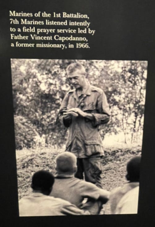 “On Sept. 4th, 1967, Father Vincent Capodanno, a Navy Lt. and chaplain, was dying. After an extension request to the jungles of Vietnam, the [C]atholic priest, attached to the 5th Marine Regiment’s 3rd Battalion, was caught in a firefight. . .he was gunned down while shielding the medic from assault.”