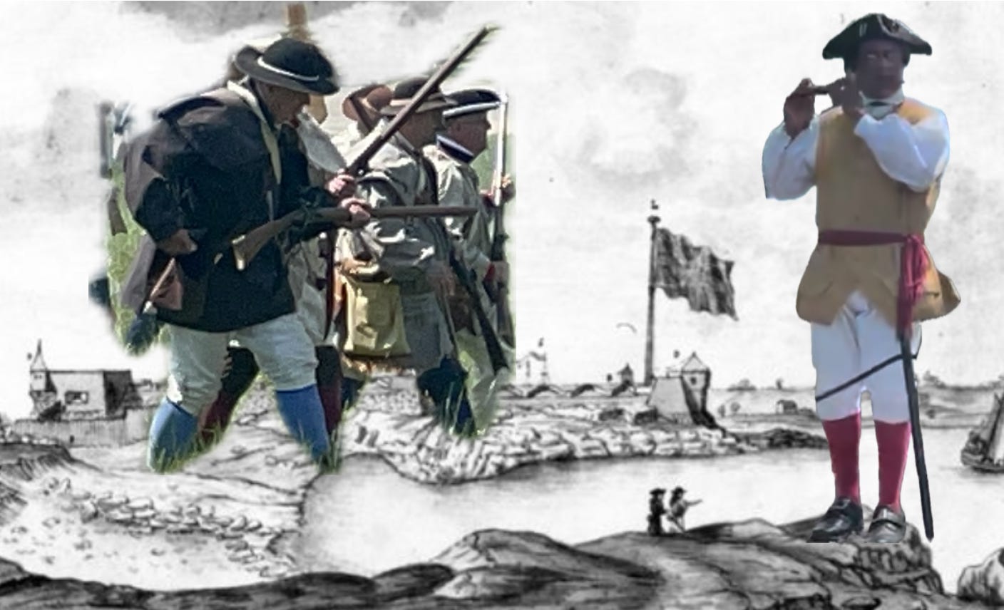 Fort William and Mary, c.1705, in the background with images of Revolutionary reenactors from Mt. Vernon