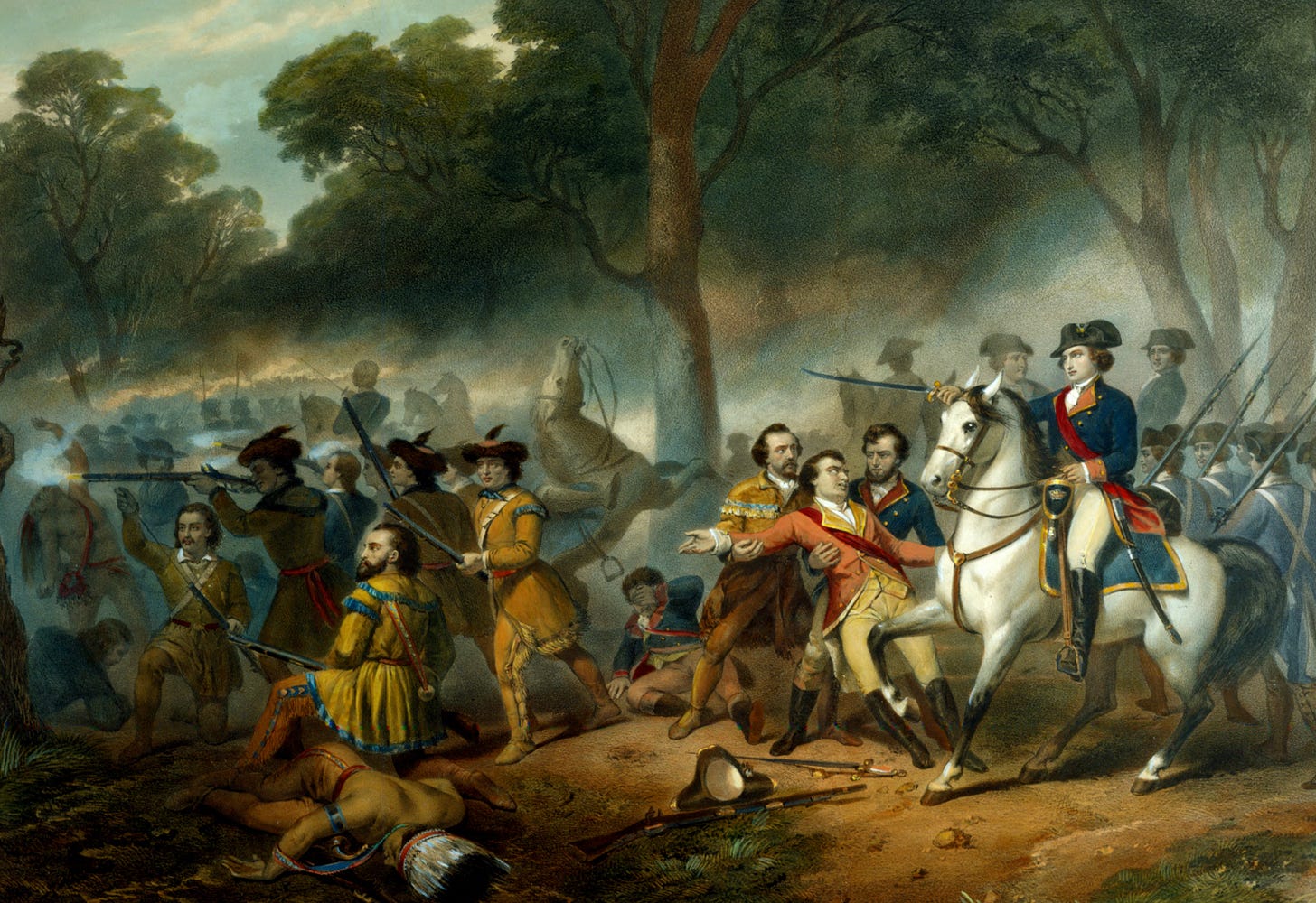 A stunning 977 of the 1,459 men of Braddock’s expedition were killed or wounded, and Washington himself—at well over six feet and rallying the troops, he was a big target for enemy shots—had two horses shot from under him and multiple bullets through his coat. And yet he was completely unscathed himself. It is a remarkable and miraculous fact that George Washington, though he spent a good deal of his life leading troops into battle, often in very dangerous situations (he was known for not taking care to shield himself), was never wounded in those battles.
