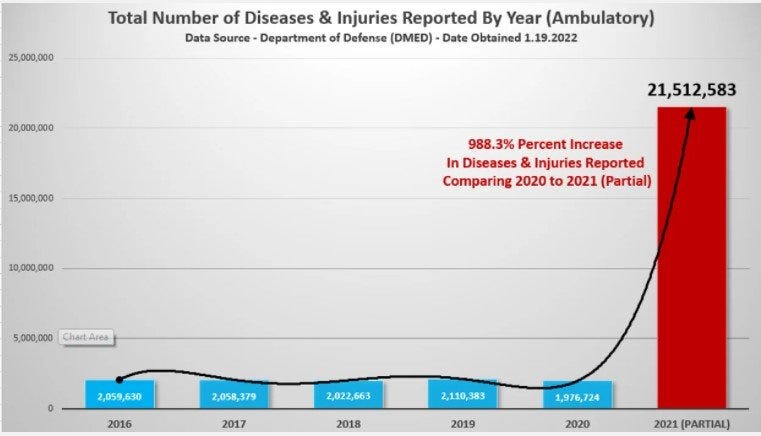 “A recent report by Daniel Horowitz at The Blaze on the Department of Defense manipulating epidemiological data after the initial data for 2021 revealed a MASSIVE increase, by 988%, in doctor visits by US military members in 2021.